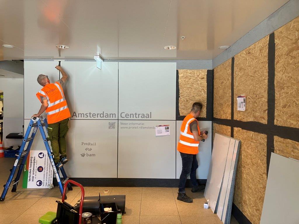 Station Amsterdam Centraal wordt de komende tien jaar flink gerenoveerd. Om de hinder voor de reiziger zoveel mogelijk te beperken, wordt in fases gewerkt waarbij de werkzaamheden zoveel mogelijk aan het zicht (en het gehoor) van de reizigers worden onttrokken. Dat wordt gedaan door op strategische plekken bouwschuttingen en wanden te plaatsen.