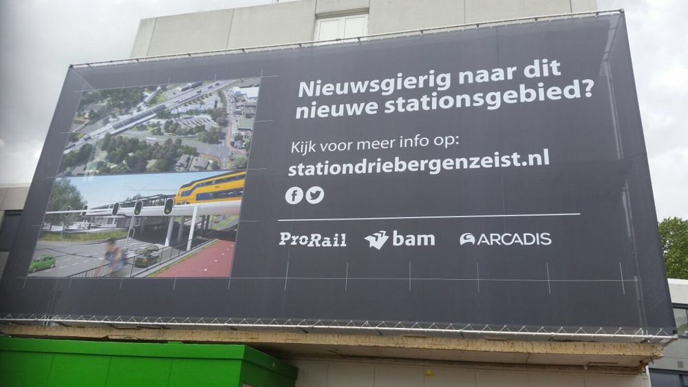 Dit geveldoek van ruim 12 bij 6 meter is een verwijzing naar de informatiepagina voor het nieuwe plan van stationsgebied Driebergen-Zeist. Voorbijgangers krijgen een beeld van het eindresultaat van de huidige bouwwerkzaamheden en kunnen zich verder informeren door naar de weergegeven website te gaan.