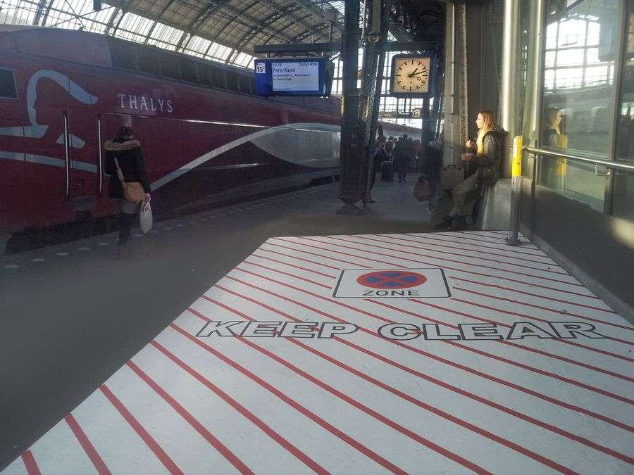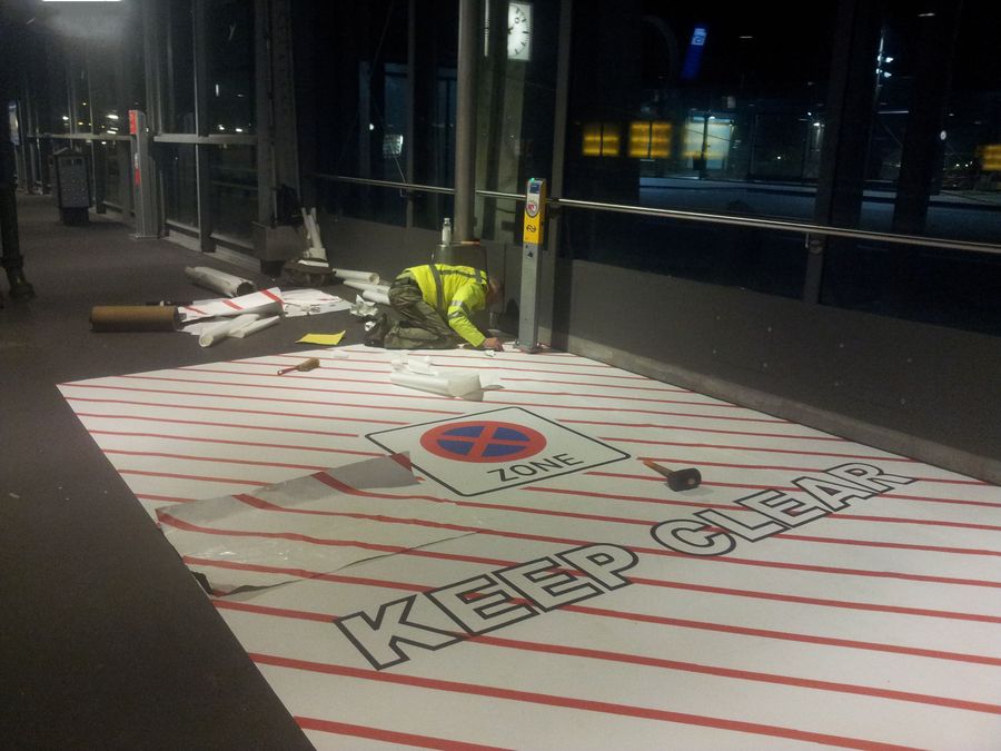In opdracht van ProRail plaatsen we 2 grote markeringsvlakken, bedoeld om de veiligheid van de reizigers op Amsterdam Centraal Station te vergroten. Het ene vlak, ruim 30 vierkante meter, moet de reiziger aangeven dat deze niet voor of bij de roltrap blijft staan. De perronmedewerkers van NS zullen de reizigers hierop attenderen zodat het gemarkeerd gedeelte vrij blijft. Het andere vlak, geel met zwart van ca. 12 vierkante meter, is op een smalle strook naast een trapportaal aangebracht en moet in combinatie met de groene pijl de reiziger verwijzen naar een veilige route, die te volgen is via de andere zijde van de perron.